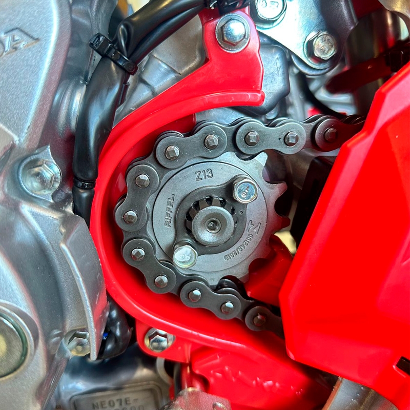 Produzido em polimero de alta resistencia, o acessorio evita que a corrente ao sair do curso, por impacto em obstaculos ou por quebra, fique presa em locais de dificil acesso.